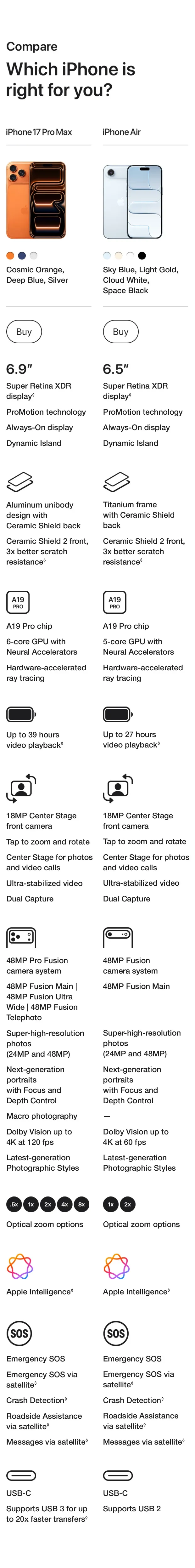 1The display has rounded corners that follow a beautiful curved design, and these corners are within a standard rectangle. When measured as a standard rectangular shape, the screen is 6.27 inches (iPhone 17, iPhone 17 Pro), 6.55 inches (iPhone Air), or 6.86 inches (iPhone 17 Pro Max) diagonally. Actual viewable area is less.