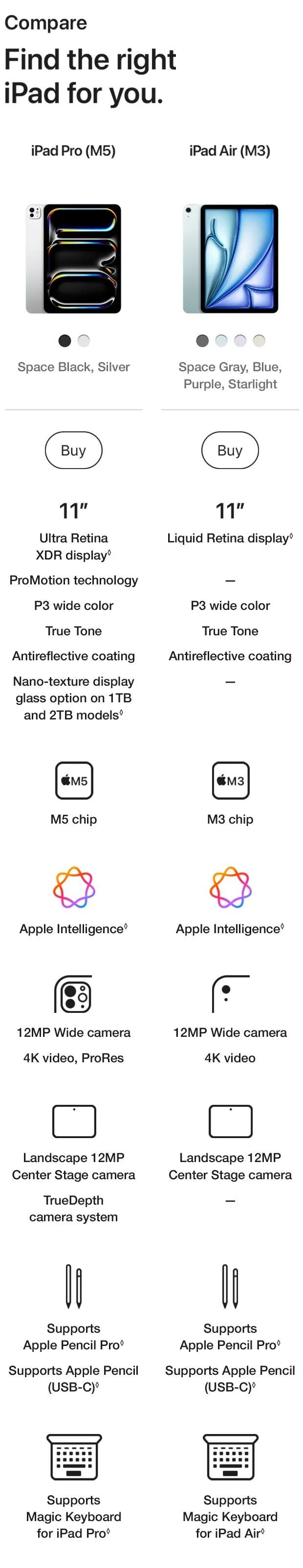 iPad Pro. Built for Apple Intelligence.1 iPad Pro, powered by the Apple M5 chip, delivers outrageous performance for effortless productivity and advanced AI workflows. With a stunning Ultra Retina XDR display, superfast Wi-Fi 72 and 5G Cellular3, Neural Accelerators for AI workloads, and a redesigned iPadOS, there’s no limit to what you can do with iPad Pro. Paired with Apple Pencil Pro and Magic Keyboard for iPad Pro, it brings endless versatility, creativity, and productivity to your fingertips.